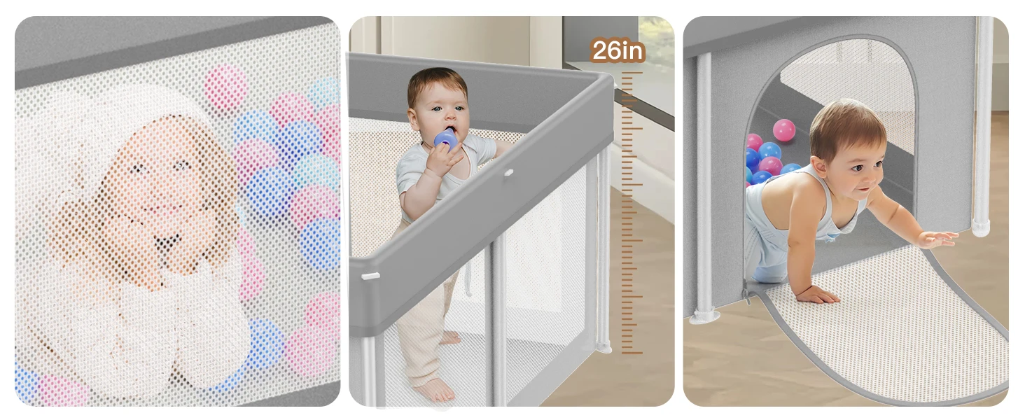 - 360° All-VISION DESIGN:The 360° all-vision design of this baby playpen allows parents to keep an eye on their little ones from all angles.Children can see you outside the mesh from multiple sides, no matter whether they are sitting or lying down, which will make them feel safe.