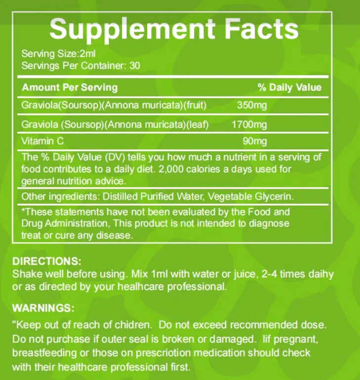 - Made in the USA, 100% Organic: Our soursop liquid drops are proudly made in the USA with organic, high-quality ingredients. Each 2fl oz (60ml) bottle contains a potent formula crafted for optimal absorption. Whether you're seeking to improve your digestion, boost your immunity, or enhance your energy levels, our soursop liquid drops are the perfect addition to your wellness routine. Feel the difference with every drop!